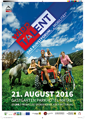Nach der sehr erfolgreichen Veranstaltung im August letzten Jahres, macht die Wipptaler Jugendplattform NEXT erneut mit einer Initiative auf sich aufmerksam. Junge, kunstinteressierte WipptalerInnen erhalten die Möglichkeit, Workshops zu unterschiedlichen Kunstrichtungen zu besuchen und ihre Arbeiten bei einem Abschlussevent einem breiten Publikum zu präsentieren.
